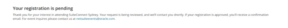 Continue through the registration process until you land on the submission page where you will see your registration status (preview below). You will also receive an email with your registration information. If you have any questions contact netsuiteevents@oracle.com.