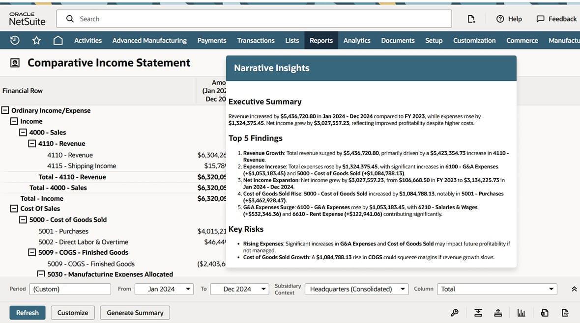 NetSuite Narrative Insights is a feature within NetSuite that helps users extract actionable intelligence from their business data. It uses AI to automatically generate easy-to-understand analyses, written in plain language, that explain key highlights and trends. By quickly interpreting and aggregating data directly within NetSuite, NetSuite Narrative Insights helps teams make faster, more data-driven decisions.