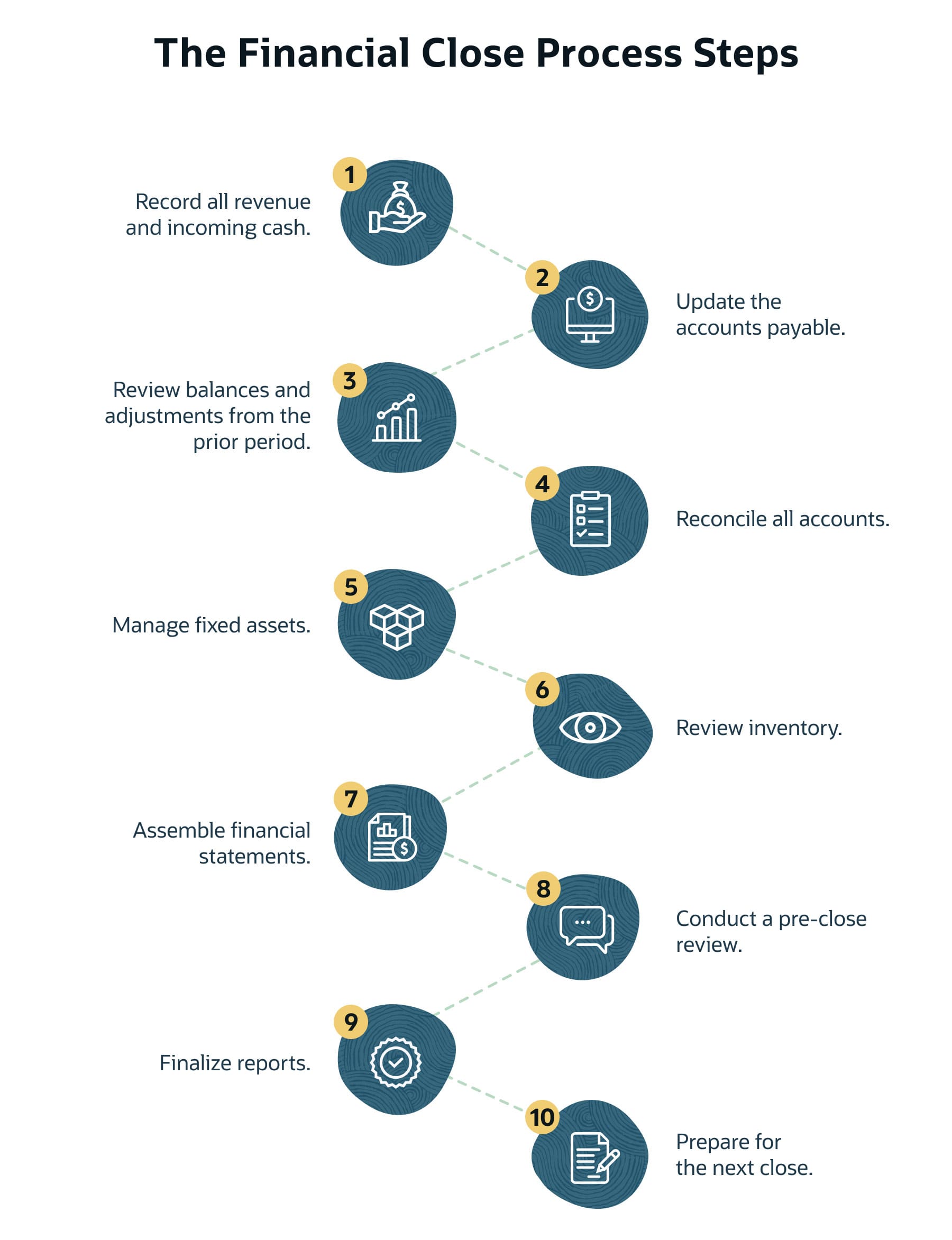 The specific tasks involved in the month-end close process may vary from company to company, depending on the type of accounts and transactions, industry standards and regulatory requirements. However, the process generally follows these 10 steps: recording all sales/revenue and accounts receivable transactions, updating accounts payable, reviewing balances and adjustments from the prior period, reconciling all accounts, reviewing fixed assets, recording inventory valuations, assembling financial statements, conducting a preclose review, finalizing reports, and closing accounts and preparing for the next close.