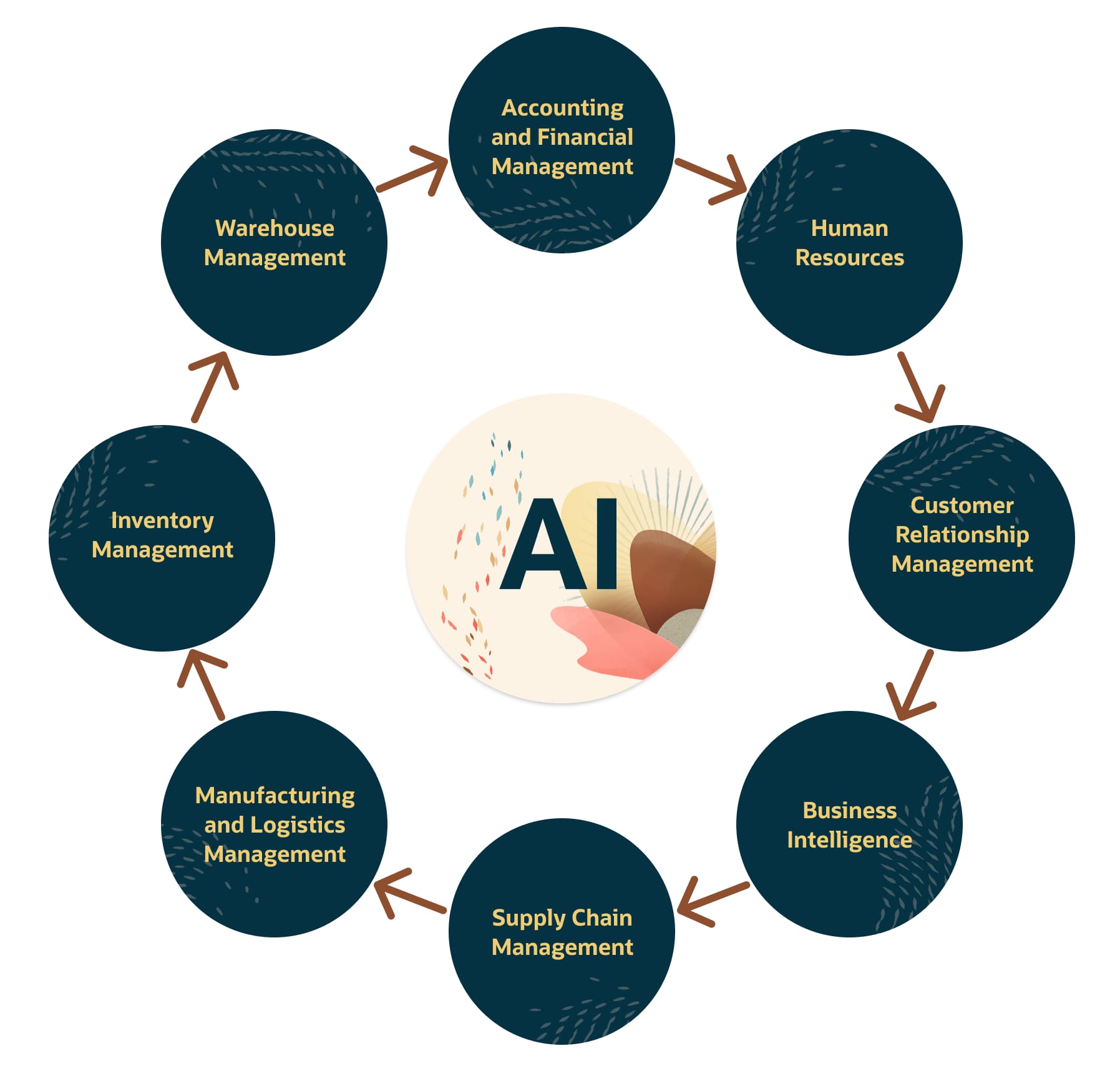 All-in-one ERP systems come packaged with a full suite of components, such as those mentioned above. This approach may be useful for mature businesses ready for a comprehensive solution. Modular ERP software, on the other hand, offers greater flexibility by letting businesses select and combine only the components—or modules—relevant to their needs, operations, and challenges, and then scale over time. A medium-sized ecommerce company, for example, might prioritize inventory management and warehouse management, whereas a small service-based organization might focus on CRM and project management modules. Leading ERP systems embed AI across components to expand what each can do. Built-in AI features help businesses analyze large data sets quickly, identify anomalies, offer strategic recommendations, and automate more complex tasks than previously possible.