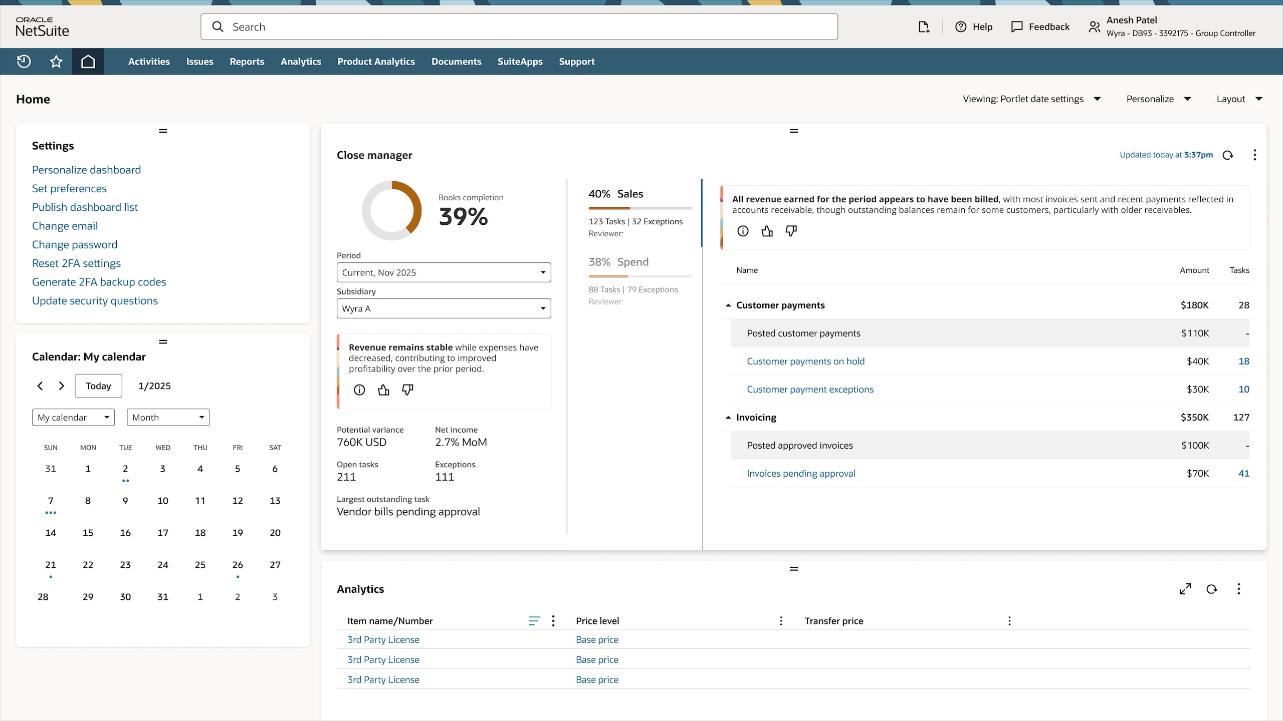 NetSuite 2026.1 introduces NetSuite Intelligent Close Manager which provides users with AI-powered, data-driven monitoring to help keep teams on track for a timely close. Finance teams can gauge progress at a glance while hyperlinked tasks minimize task switching friction and direct users to take action. Built-in AI insights highlight trends, errors, projected activities, and areas to focus on, helping accounting teams close their books with confidence and speed.