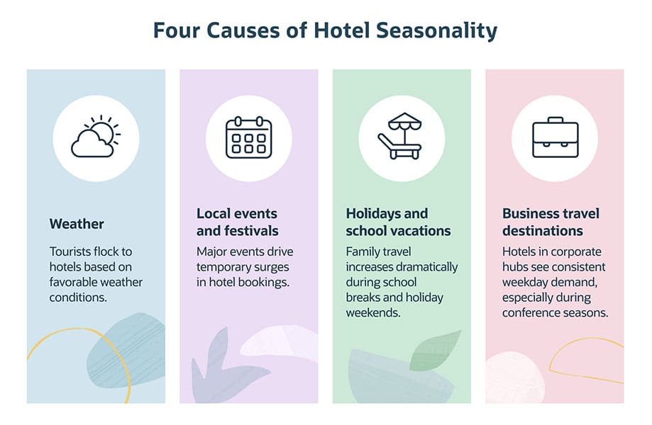 - Some of the main reasons for hotel seasonality include weather, local events, school vacations, and business-related travel.