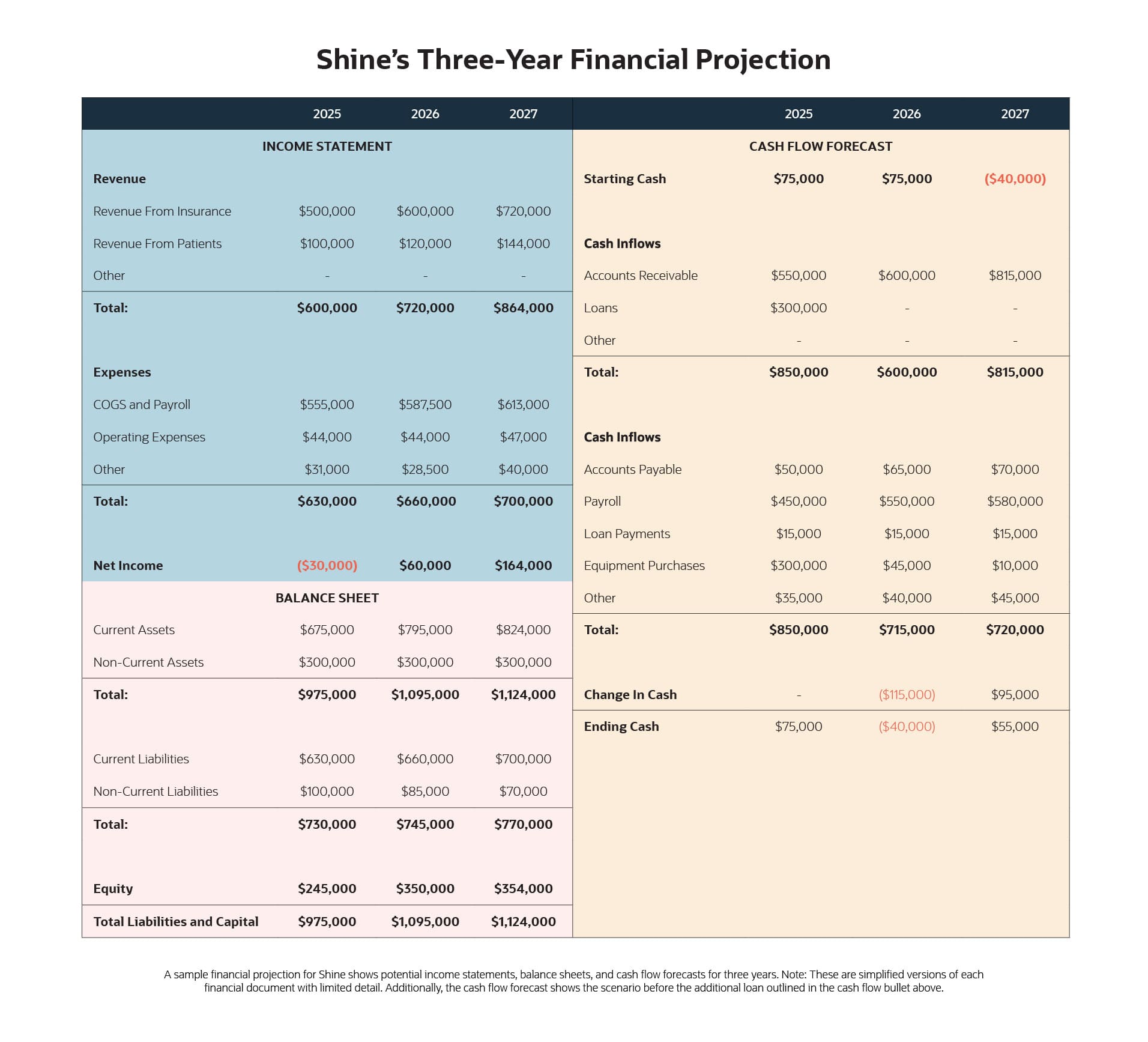 By incorporating these projection elements alongside potential revenue patterns and break-even analysis to set daily patient goals, Shine secured its loan and established clear performance benchmarks to monitor progress. When actual patient volume exceeded projections by 15% in the first quarter, it revised its projections upward and accelerated its timeline to open a second location from year six to year five.