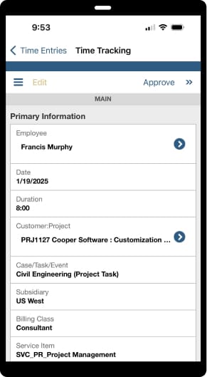 NetSuite timesheet management provides time tracking integration through a unified platform that connects timesheet data directly to core ERP, project management, HR, CRM, and payroll functions via APIs and built-in connectors. Employees can submit detailed hours via web or mobile device, assign working hours to multiple projects or tasks, and even use the system when offline and submit when back online. Real-time updates across the NetSuite ecosystem supports more accurate project costing, better resource allocation, advanced analytics and reporting, and faster invoicing and billing, along with automatic posting of logged time to the organization’s general ledger. NetSuite timesheet management’s suite of features and real-time data syncing reduce organizational errors, eliminate manual data entry labor, and improve decision making and resource planning.