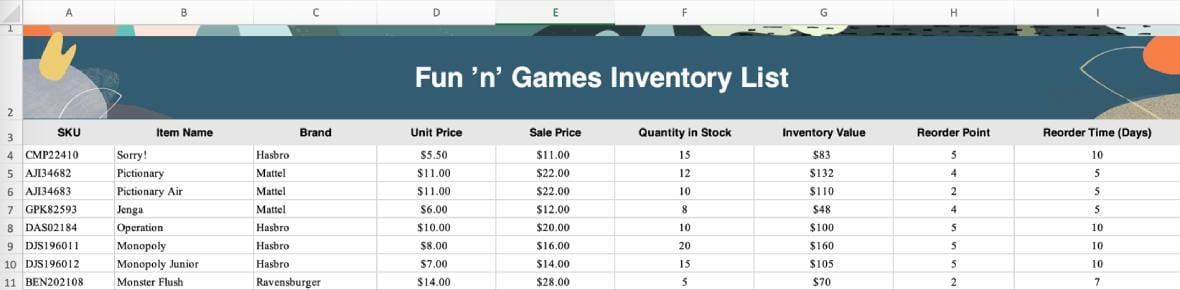 As an example, let’s think about a basic inventory list for a hypothetical toy store named Fun ’n’ Games. The list contains all of the games it stocks on-premises. Each game has a unique SKU, even for variations of the same game, such as Monopoly and Monopoly Junior. Also included on the list: the game’s name, its maker (for example, Hasbro), its unit price (how much the game cost the store to purchase), how much the store charges customers for the game, how many games are in stock, the value of the inventory (unit price times quantity), when it’s time to reorder, and, finally, the time it takes for a reorder to be received.